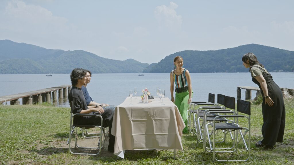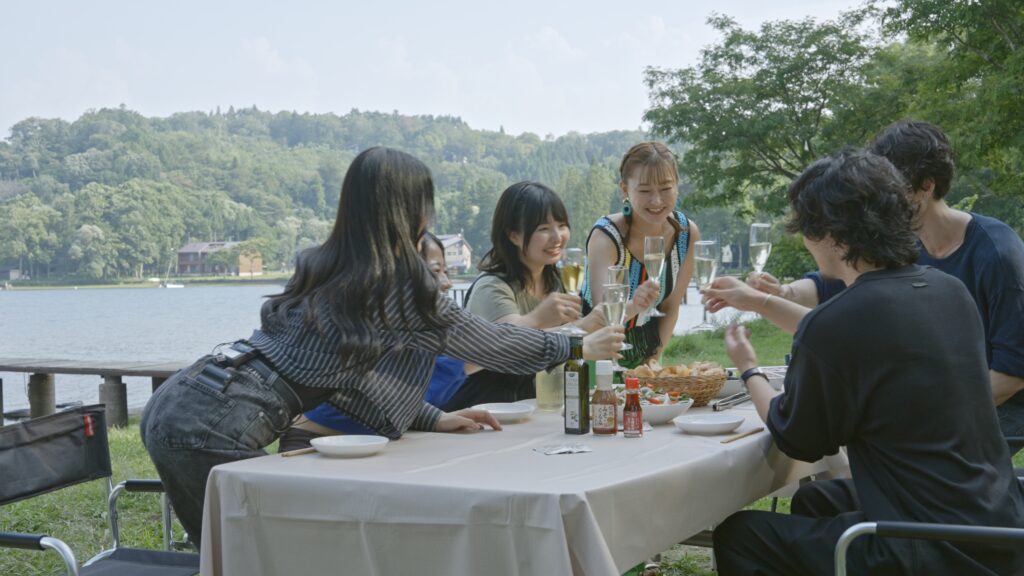 出会いとはじまりの舞台。湖畔での自己紹介と焚き火トークを通じて関係性が動き出す。